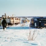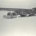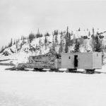 Tracked tractors or, as they are more commonly known, Caterpillar tractors, developed in the early 1900s. By the 1930s, they had become solid and reliable enough to haul freight during northern winters and became known as the ‘cat train.’ A cat train is simply one or more Caterpillar tractors pulling large, heavy sleighs or skids carrying tons of freight over snow and frozen lakes in the winter. A caboose at the end of each cat train was where the men operating the cat train ate and slept, even while the convoy was underway. Cat trains worked only in winter when the lakes and ground were frozen solid.